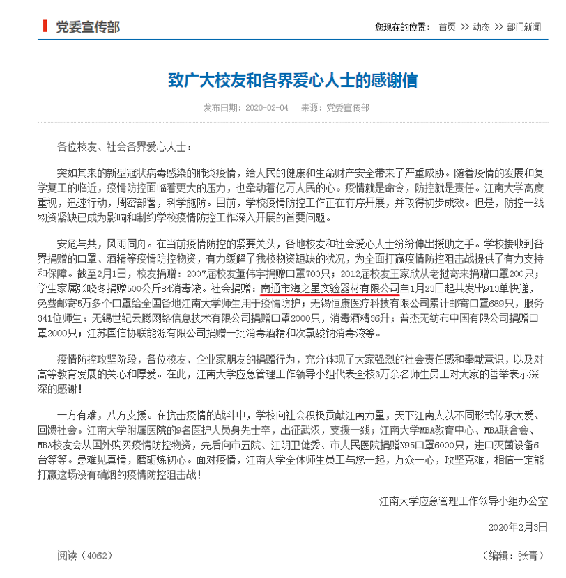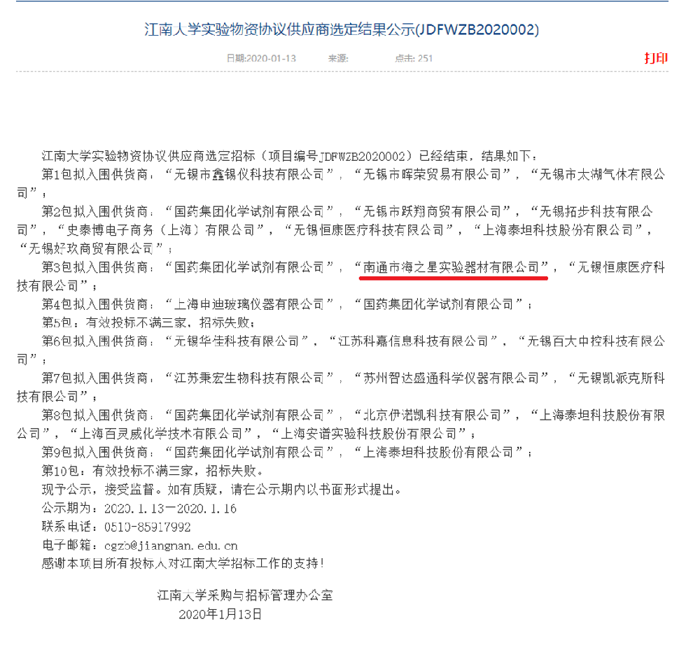 江南大學實驗物資協(xié)議供應商選定結(jié)果公示(JDFWZB2020002)